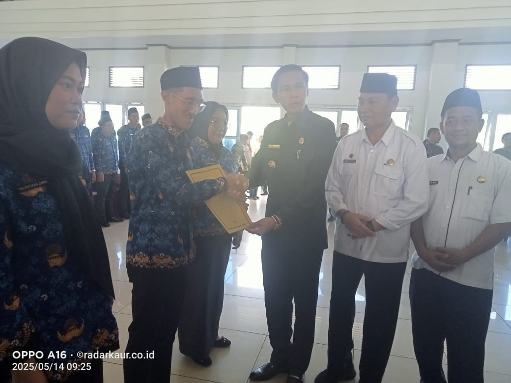 KAUR, RADARKAUR.CO.ID — Bupati Kaur Gusril Pausi, S.Sos, MAP melantik 87 Calon Pegawai Negeri Sipil (CPNS) Pemerintah Daerah Kabupaten Kaur sekaligus penyerahan Surat Keputusan (SK), Rabu pagi 14 Mei 2025 di Aula Gedung Serba Guna Pemda Kaur.