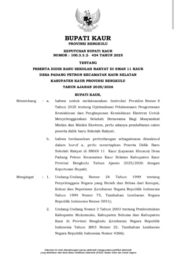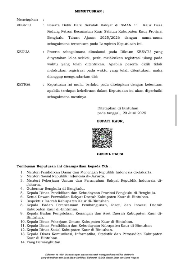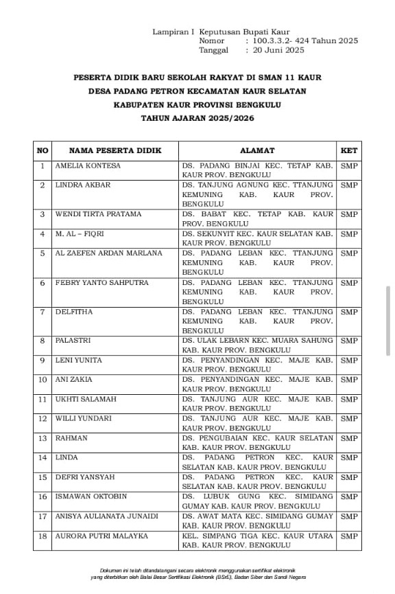 Pemerintah kabupaten Kaur menetapkan Peserta Didik Baru Sekolah Rakyat di SMAN 11 Kaur (Layanan Khusus) Desa Padang Petron Kecamatan Kaur Selatan Kabupaten Kaur Provinsi Bengkulu Tahun Ajaran 2025/2026.
