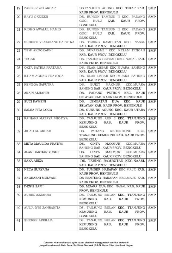 Berikut daftar nama calon peserta didik baru Sekolah Rakyat di Kabupaten Kaur: