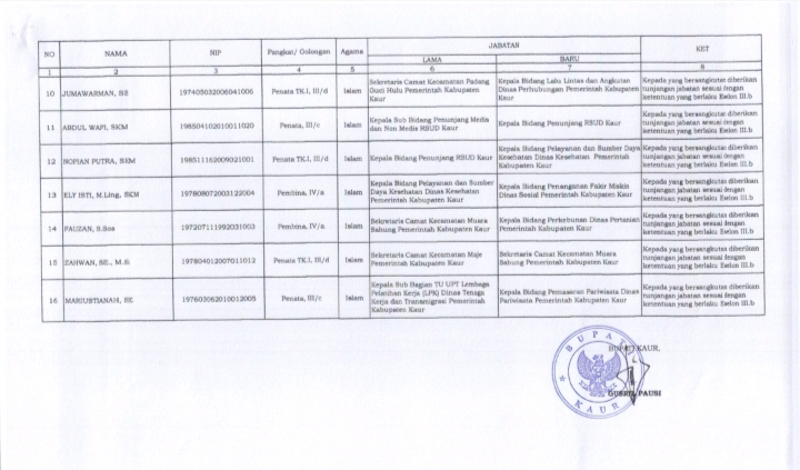 KAUR, RADARKAUR.DISWAY.ID - Gerbong mutasi pejabat eselon di lingkungan pemerintah Kabupaten Kaur kembali bergerak.