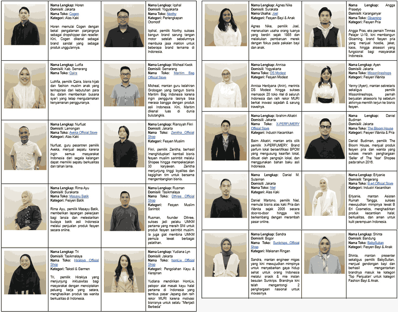 Berikut ini adalah profil singkat dari peringkat 20 besar Shopee Jagoan UMKM Naik Kelas